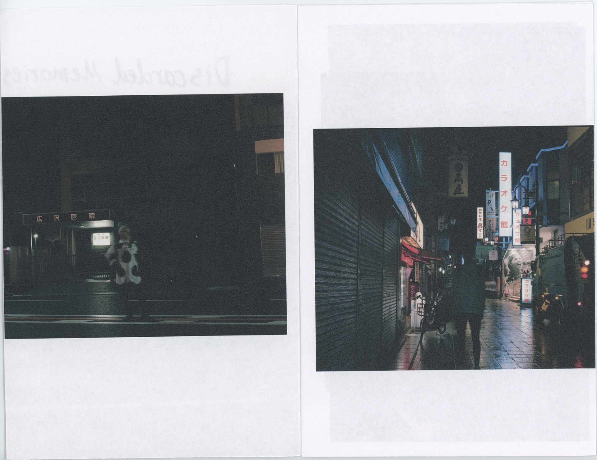 Discarded Memories(捨てられた記憶)をテーマに、世の中に出す予定のなかった失敗した写真で小冊子を作りました。テーマの儚さを感じてもらうため、失敗作の写真を使い、どこにでもあるレターサイズ(アメリカで制作したため)の用紙を使い、製本も紙を二つ折りにするだけに留めました。